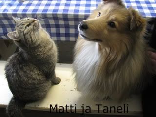 Kaikki vierailijat ovat poistuneet ja hiljaisuus laskeutunut taloon. Matti-kisu tuli hyvin toimeen nelijalkaisten vieraiden kanssa, tässä ollaan porukalla herkkupalaa odottamassa   [:-)].
